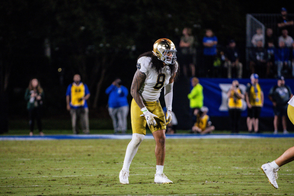 NAVY (8/26): Made his season debut against Navy in Dublin, Ireland … Finished with seven tackles, four solo in the victory … Added a forced fumble in the win, and was named the defensive player of the game for the Irish