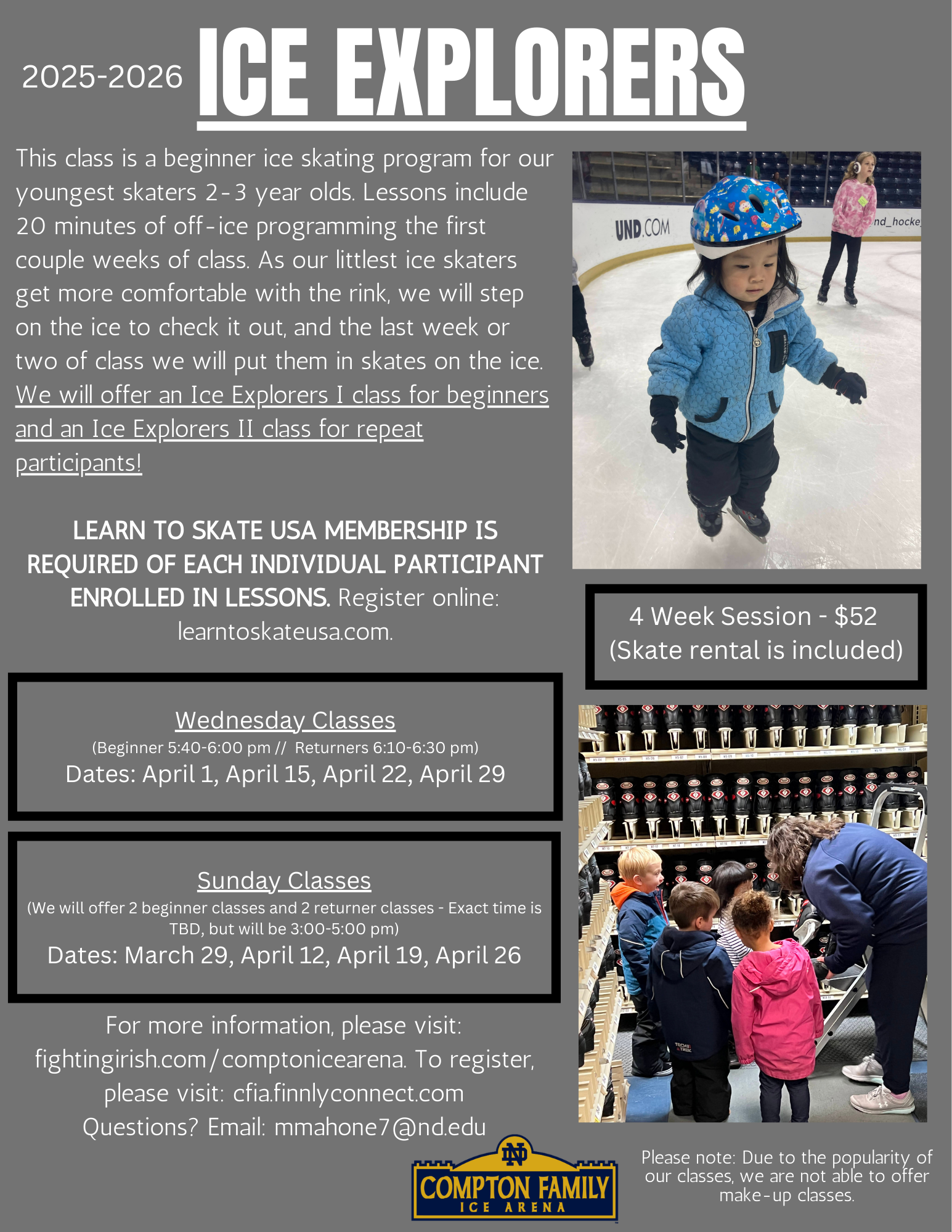 - Ice Explorers: Introductory class for our youngest skaters (2-3 years old). This class is a beginner ice skating program for our youngest skaters. Lessons include 20 minutes of off-ice programming the first several weeks of the class. As our littlest ice skaters get more comfortable with the rink, we will step on the ice to check it out, and the last week or two of class we will put them in skates on the ice.